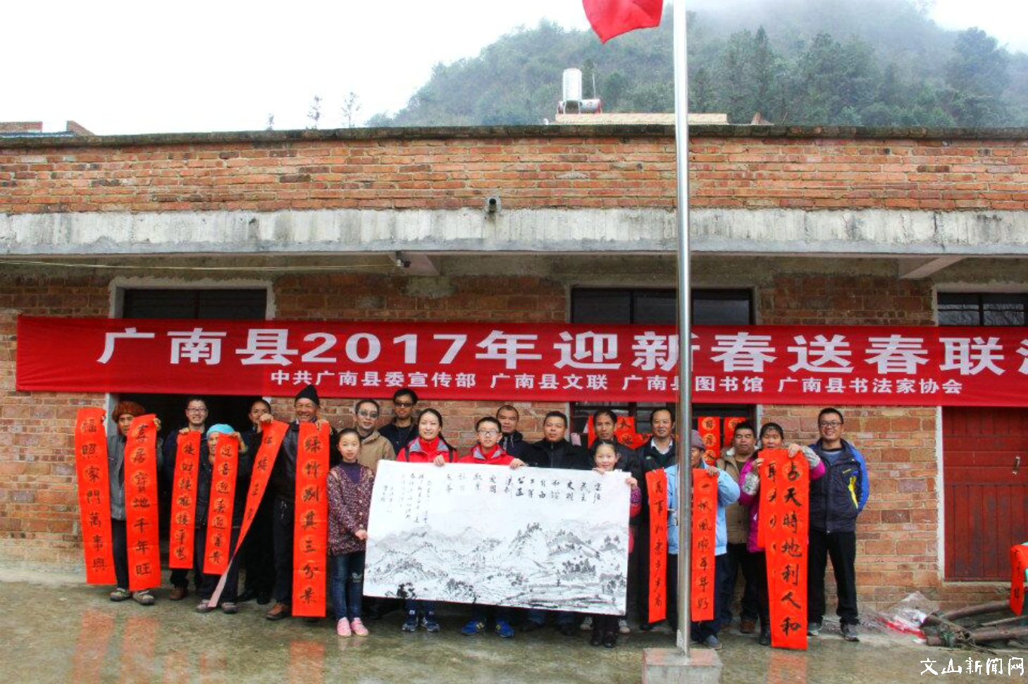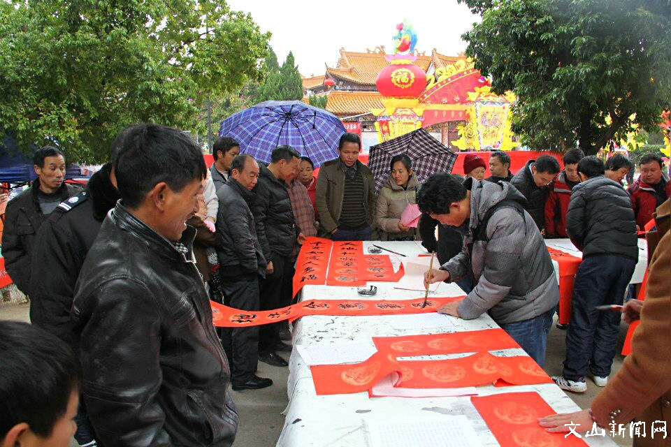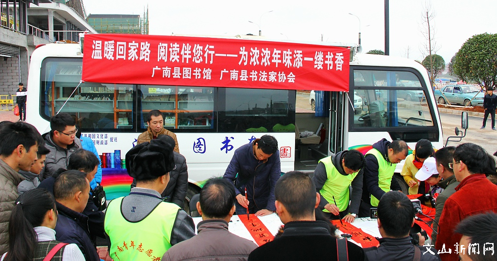 文网讯 “接福迎春辞旧岁,打工致富建家”“出门求财财到手,在家创业业兴旺”,刚下高铁的乘客们兴致勃勃,向站前免费送春联的活动现场聚拢来,随着书家们的落笔题联,高声齐念。“我从广东打工回来,第一次坐高铁回家,没想到刚下高铁,还免费拿到祝福春联,心里感到很温暖。不管走多远,还是家乡好啊!”潘先生高举一幅刚领到的春联,喜形于色。1月13日至15日,由县委宣传部组织,县文联、县图书馆、广南书法家协会等单位联合开展免费春联大放送活动。