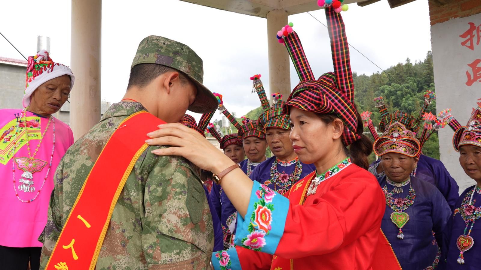 欢送队伍在学生们敲锣打鼓的引领下走向村口。陆显俊与母亲陆发丽走在队伍中央,身后是身着壮族盛装的乡亲。在“送军亭”前,母亲陆发丽含泪为儿子整理着装,叮嘱他在部队好好表现。她说,“希望他牢记使命,不怕吃苦,传承家族红色基因,更好担负新时代革命军人的职责。”乡亲们纷纷与陆显俊合影,女友送上精心准备的鞋垫表达情意与祝福。身着盛装的村民陆恩玉表示:“看见年轻人穿军装,我们像过年一样高兴。再远也要来送,这是我们者偏村最大的荣耀!”