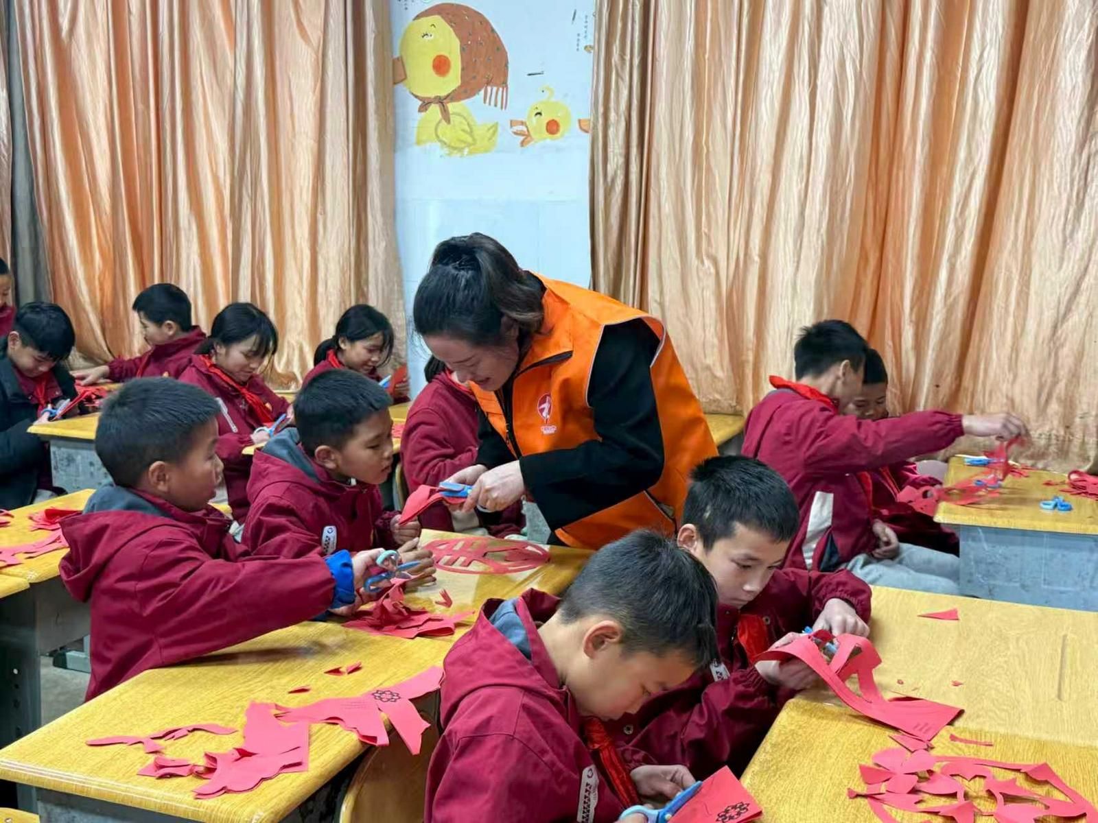 文化的滋养,让“高光时刻”更添底蕴。剪窗花环节,社工的手掌包裹着孩子的小手,一起将红纸折成方块、剪出弧线。“老师你看,我剪的雪花有六个角!”“我这个‘春’字旁边还有小花呢!”孩子们举着作品互相展示,鲜红的剪纸映着笑脸,传统文化的种子在指尖悄然发芽。这是属于他们的“文化高光”。